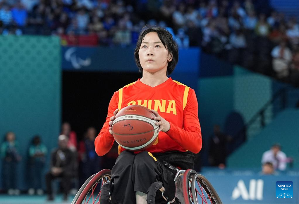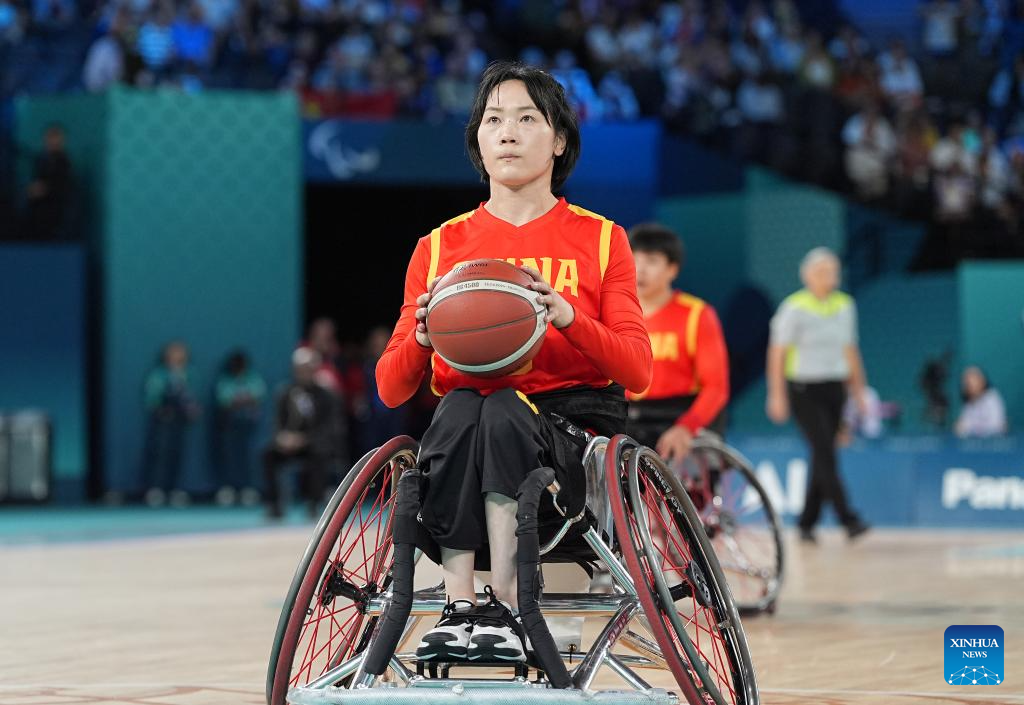 Chen Xuejing of China prepares to shoot for penalty during the wheelchair basketball women's preliminary round Group A match between Canada and China at the Paris 2024 Paralympic Games in Paris, France, Aug. 29, 2024. (Xinhua/Gao Jing)