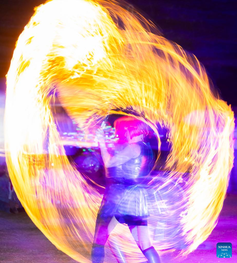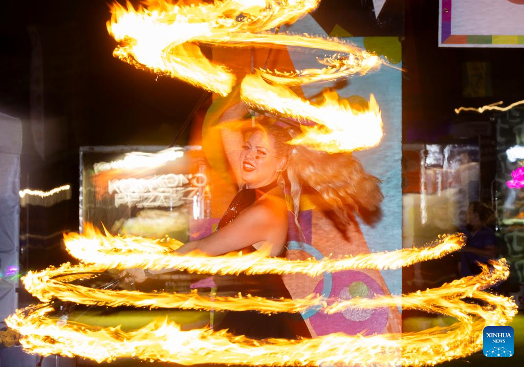 A busker performs with fire during the 2024 Toronto International BuskerFest in Toronto, Canada, on Aug. 30, 2024. This 4-day event kicked off here on Friday with 100 performers from around the world. (Photo by Zou Zheng/Xinhua)