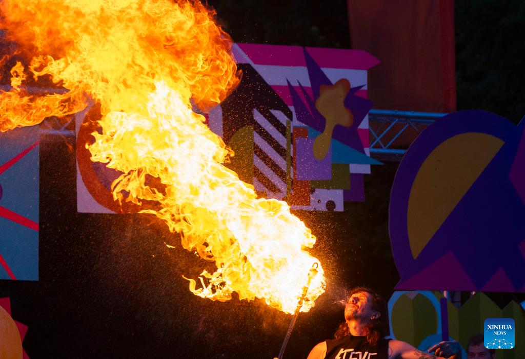 A busker blows fire during the 2024 Toronto International BuskerFest in Toronto, Canada, on Aug. 30, 2024. This 4-day event kicked off here on Friday with 100 performers from around the world. (Photo by Zou Zheng/Xinhua)