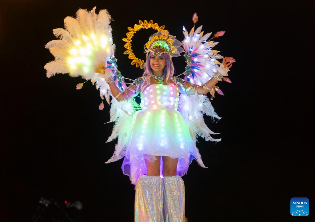 A dressed-up busker poses for photos during the 2024 Toronto International BuskerFest in Toronto, Canada, on Aug. 30, 2024. This 4-day event kicked off here on Friday with 100 performers from around the world. (Photo by Zou Zheng/Xinhua)