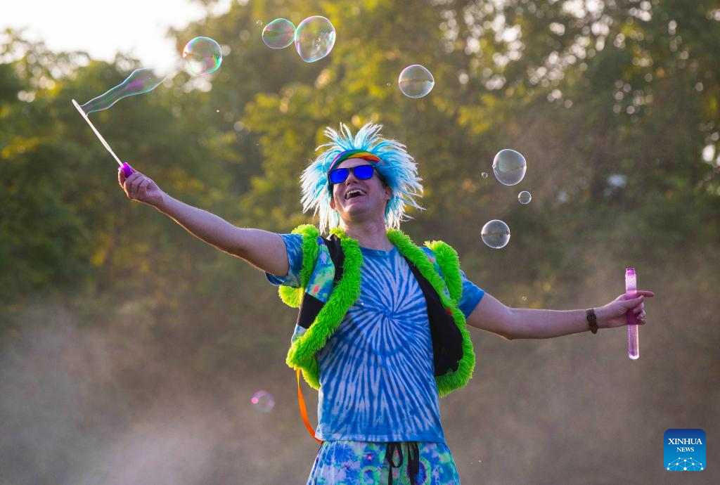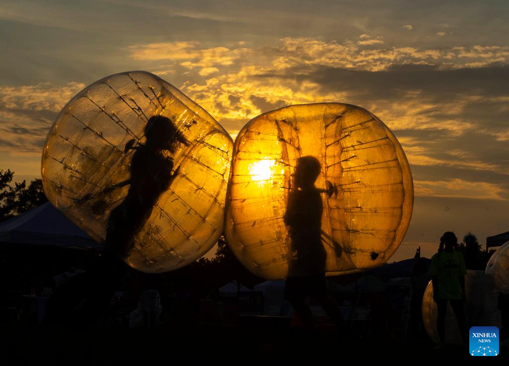 People play bubble balls at the 2024 Toronto International BuskerFest in Toronto, Canada, on Aug. 30, 2024. This 4-day event kicked off here on Friday with 100 performers from around the world. (Photo by Zou Zheng/Xinhua)