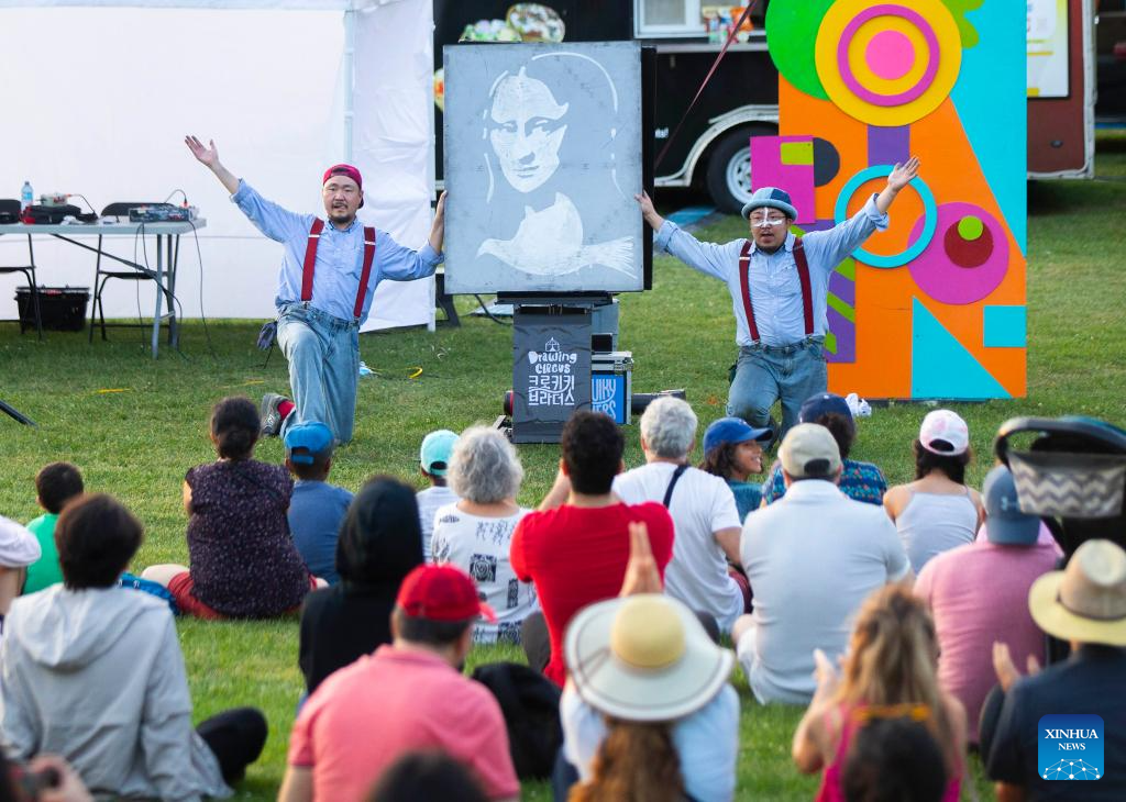 Buskers perform as people watch during the 2024 Toronto International BuskerFest in Toronto, Canada, on Aug. 30, 2024. This 4-day event kicked off here on Friday with 100 performers from around the world. (Photo by Zou Zheng/Xinhua)