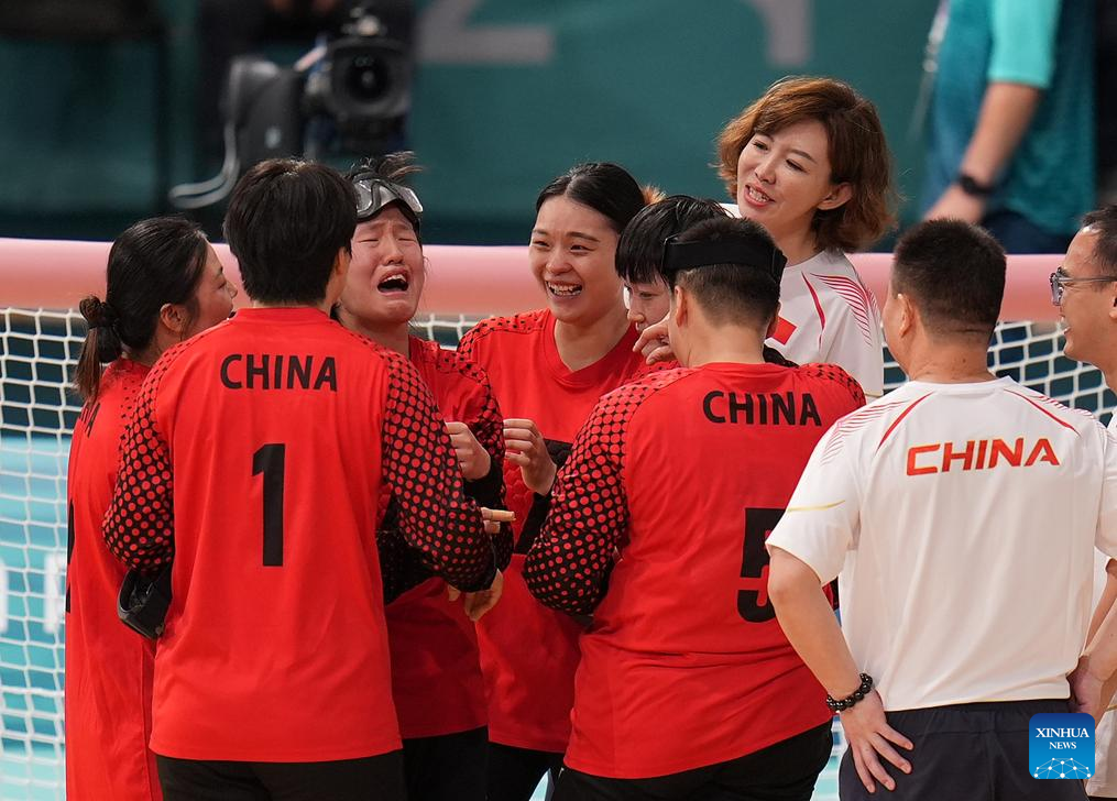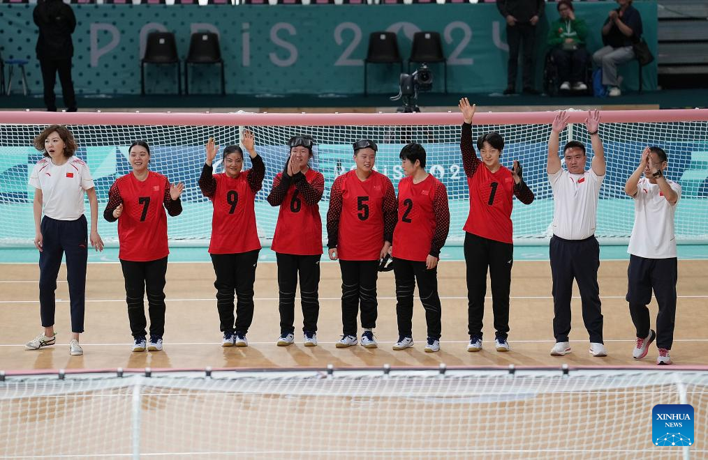 Team China celebrate after winning the Goalball Women's Preliminary Round Pool C Game between China and Türkiye at the Paris 2024 Paralympic Games in Paris, France, Aug. 30, 2024. (Xinhua/Hou Zhaokang)
