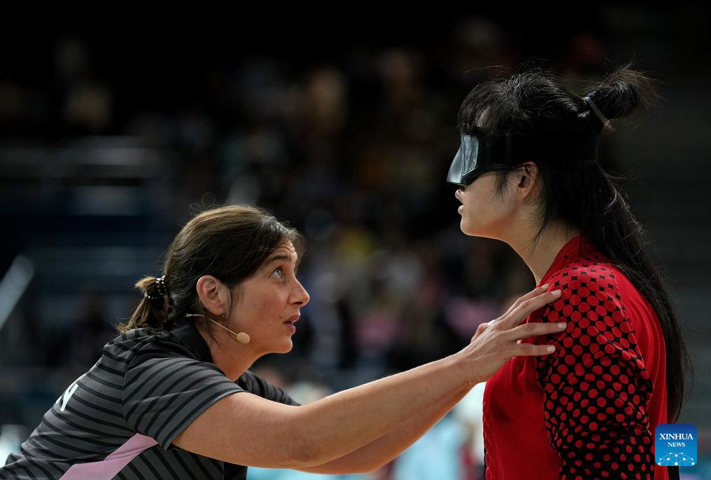 Referee checks the eyewear on Wang Chunyan of China prior to the Goalball Women's Preliminary Round Pool C Game between China and Türkiye at the Paris 2024 Paralympic Games in Paris, France, Aug. 30, 2024. (Xinhua/Hou Zhaokang)