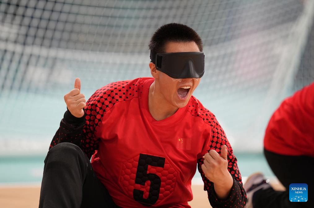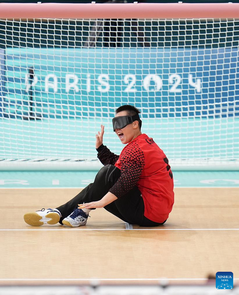 Xu Miao of China celebrates during the Goalball Women's Preliminary Round Pool C Game between China and Türkiye at the Paris 2024 Paralympic Games in Paris, France, Aug. 30, 2024. (Xinhua/Hou Zhaokang)