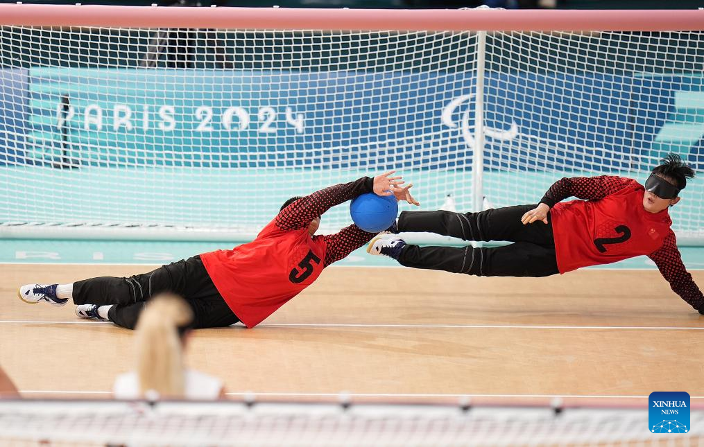 Cao Zhenhua (R) and Xu Miao of China competes during the Goalball Women's Preliminary Round Pool C Game between China and Türkiye at the Paris 2024 Paralympic Games in Paris, France, Aug. 30, 2024. (Xinhua/Hou Zhaokang)