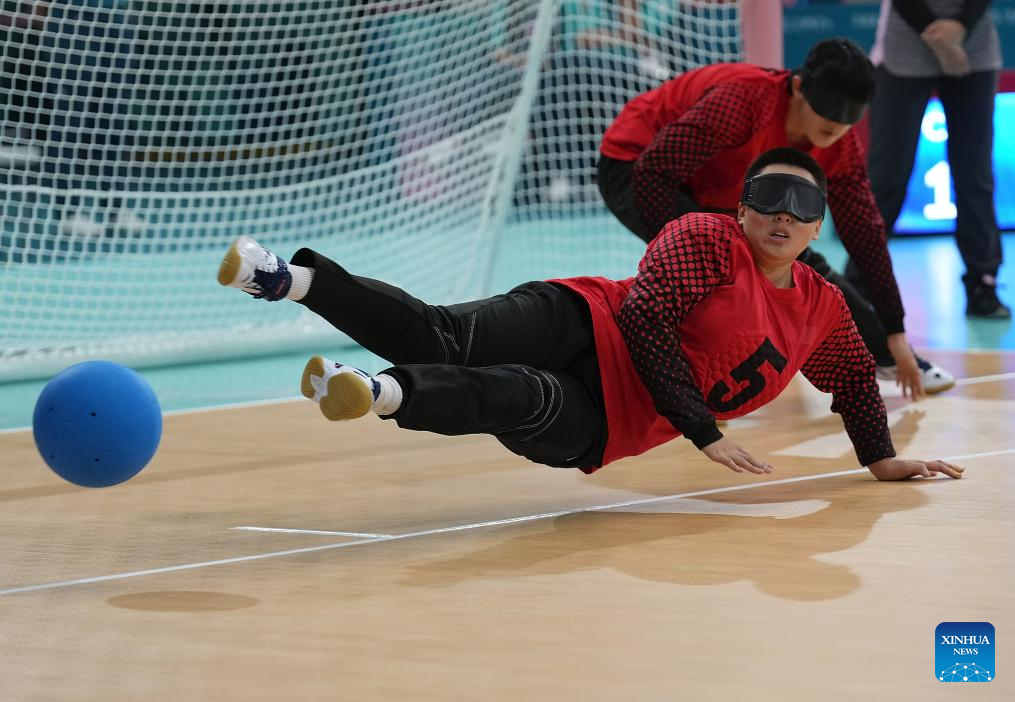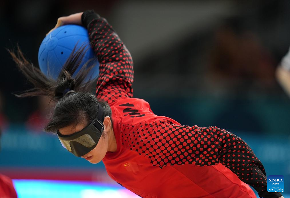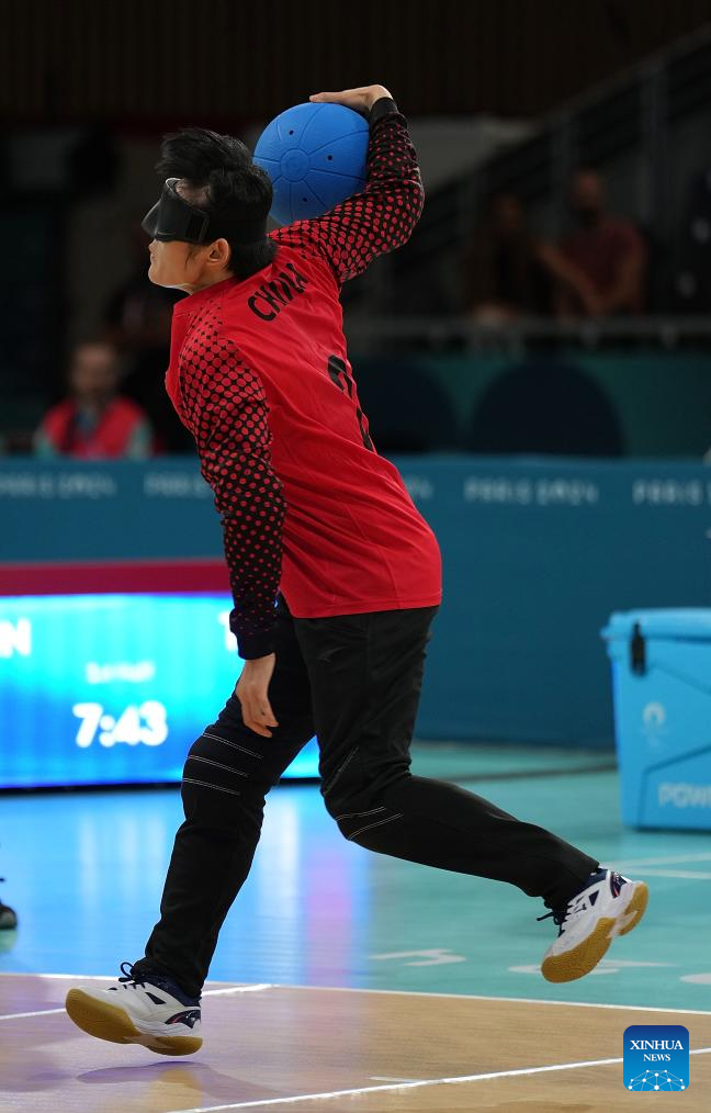 Cao Zhenhua of China competes during the Goalball Women's Preliminary Round Pool C Game between China and Türkiye at the Paris 2024 Paralympic Games in Paris, France, Aug. 30, 2024. (Xinhua/Hou Zhaokang)