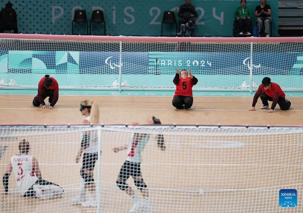 Wang Chunyan (3rd L) of China reacts after winning the Goalball Women's Preliminary Round Pool C Game between China and Türkiye at the Paris 2024 Paralympic Games in Paris, France, Aug. 30, 2024. (Xinhua/Hou Zhaokang)