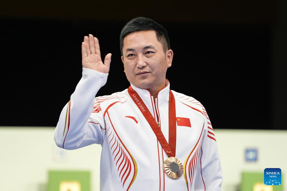 Bronze medalist Yang Chao of China celebrates during the awarding ceremony for the men's 10m air pistol P1-SH1 event of shooting para sport at the Paris 2024 Paralympic Games in Chateauroux, Aug. 30, 2024. (Xinhua/Peng Ziyang)