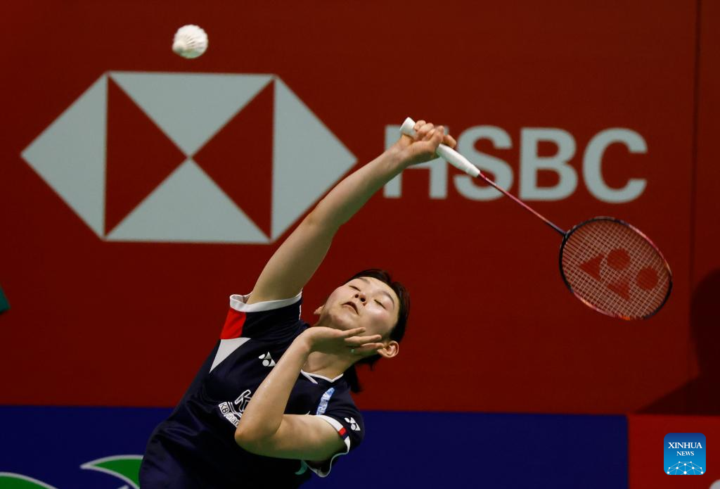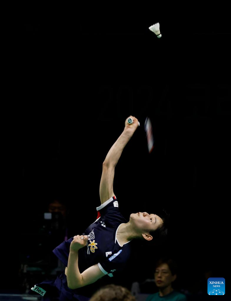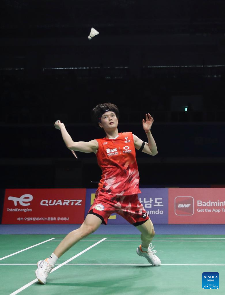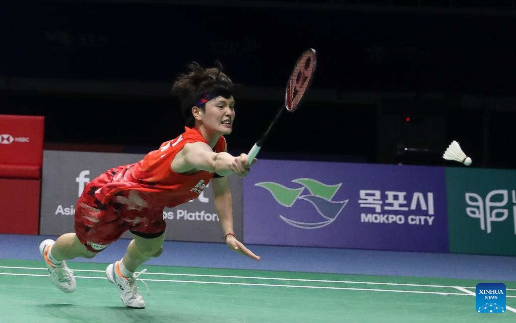 Wang Zhiyi competes during the women's singles semifinals between Wang Zhiyi of China and Sim Yu jin of South Korea at the BWF Korea Open Badminton Championships 2024 in Mokpo, South Korea, Aug. 31, 2024. (Xinhua/Yao Qilin)
