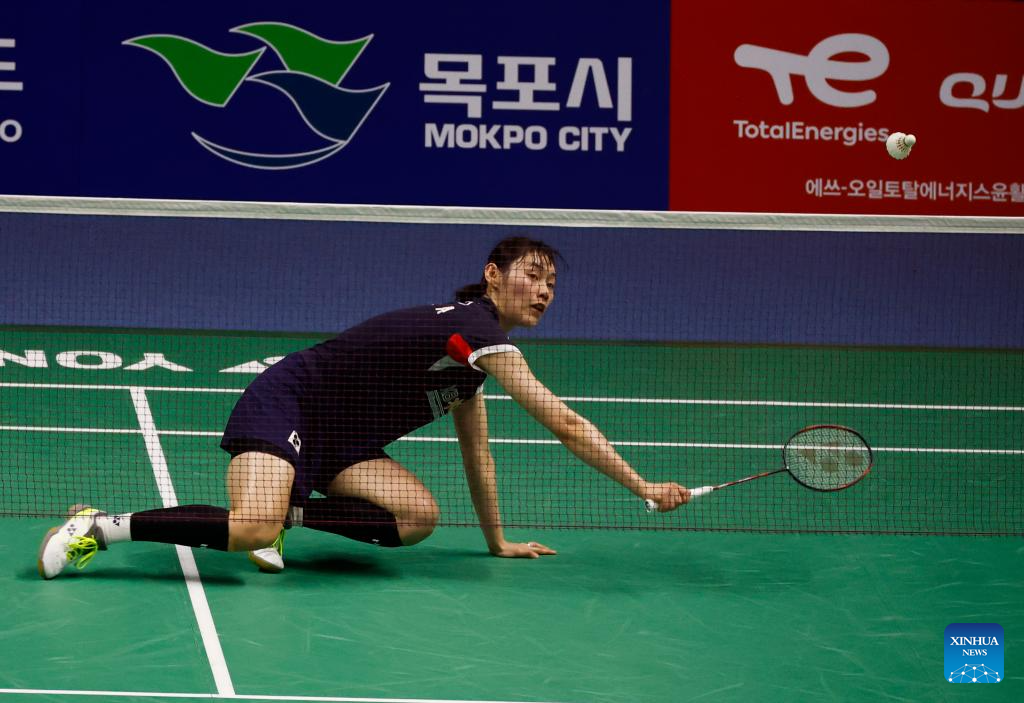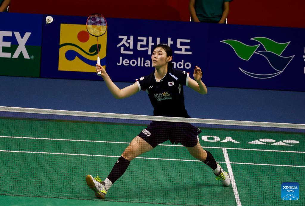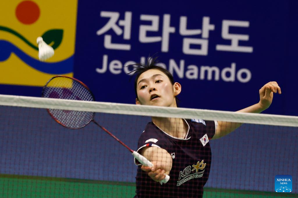 Sim Yu jin competes during the women's singles semifinals between Wang Zhiyi of China and Sim Yu jin of South Korea at the BWF Korea Open Badminton Championships 2024 in Mokpo, South Korea, Aug. 31, 2024. (Photo by Jun Hyosang/Xinhua)