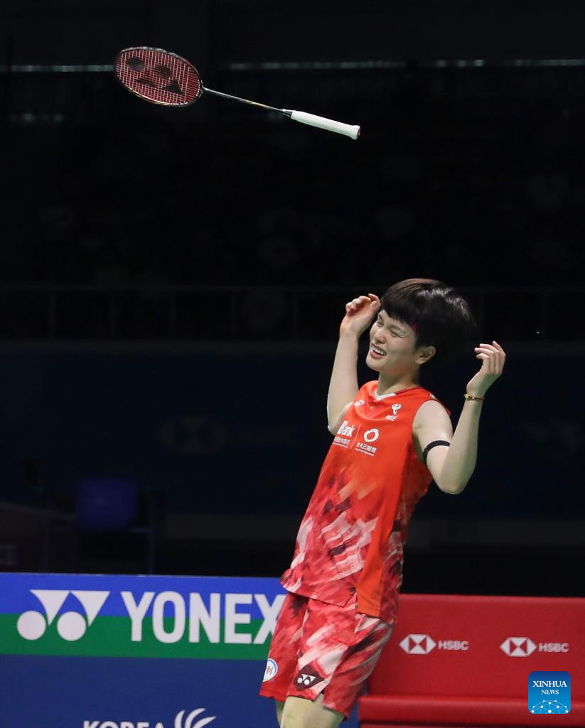 Wang Zhiyi celebrates during the women's singles semifinals between Wang Zhiyi of China and Sim Yu jin of South Korea at the BWF Korea Open Badminton Championships 2024 in Mokpo, South Korea, Aug. 31, 2024. (Xinhua/Yao Qilin)