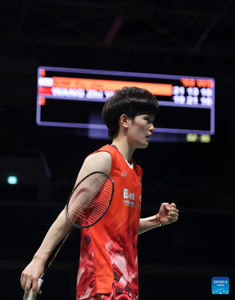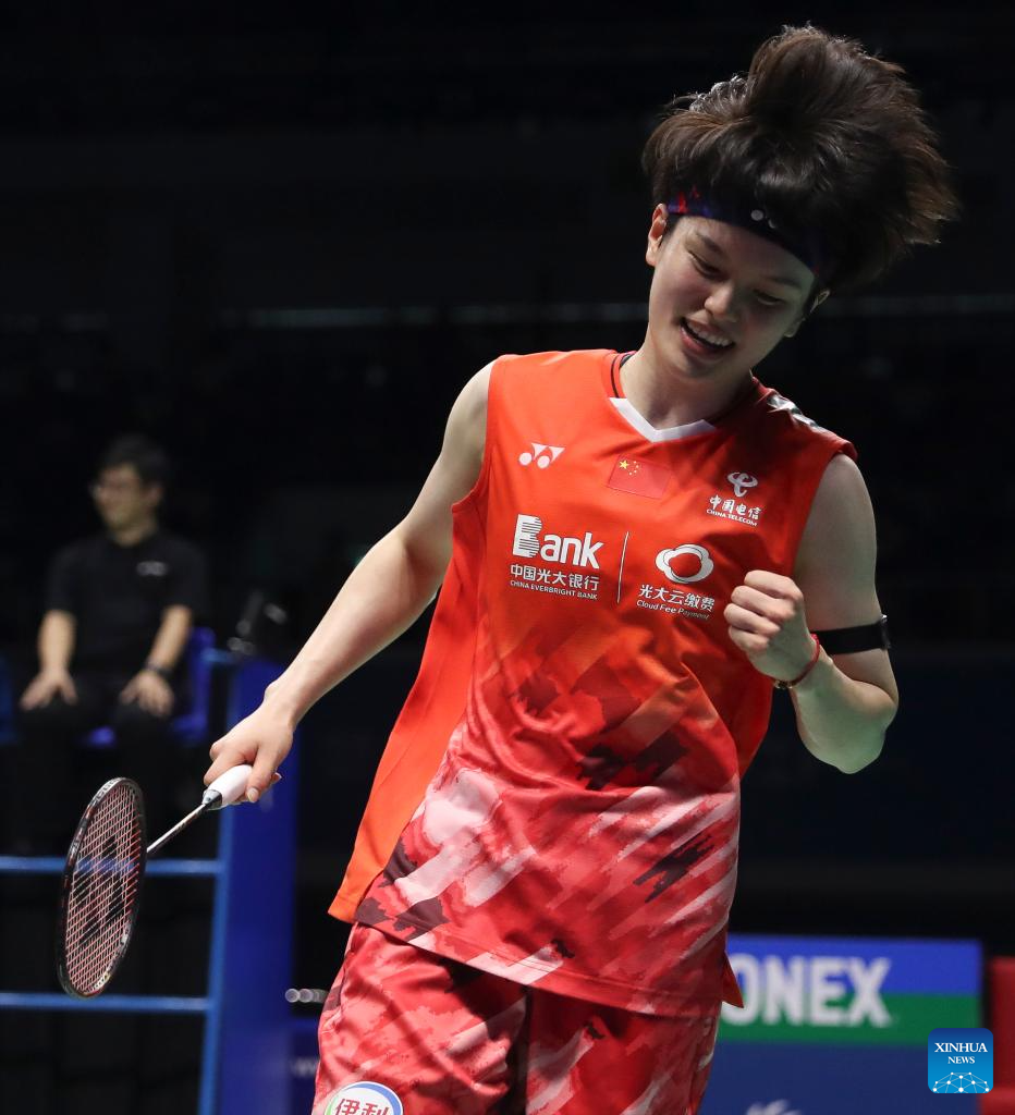 Wang Zhiyi celebrates after winning the women's singles semifinals between Wang Zhiyi of China and Sim Yu jin of South Korea at the BWF Korea Open Badminton Championships 2024 in Mokpo, South Korea, Aug. 31, 2024. (Xinhua/Yao Qilin)
