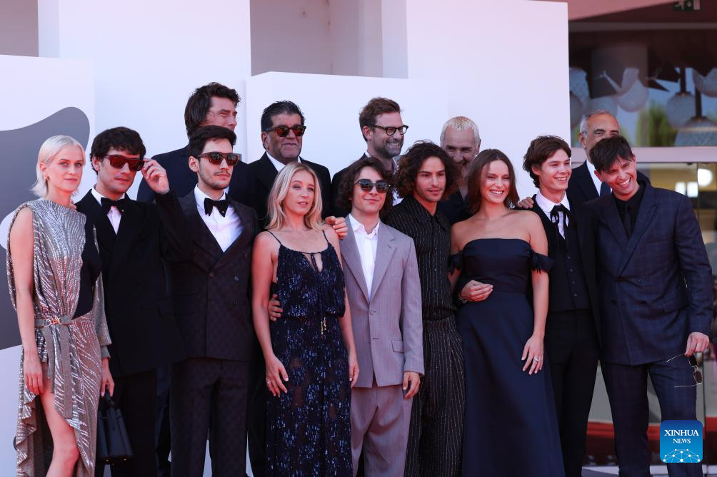 Members of the main cast of the film "And Their Children After Them" pose at the red carpet during the 81st International Venice Film Festival in Venice, Italy, Aug. 31, 2024. (Xinhua/Li Jing)