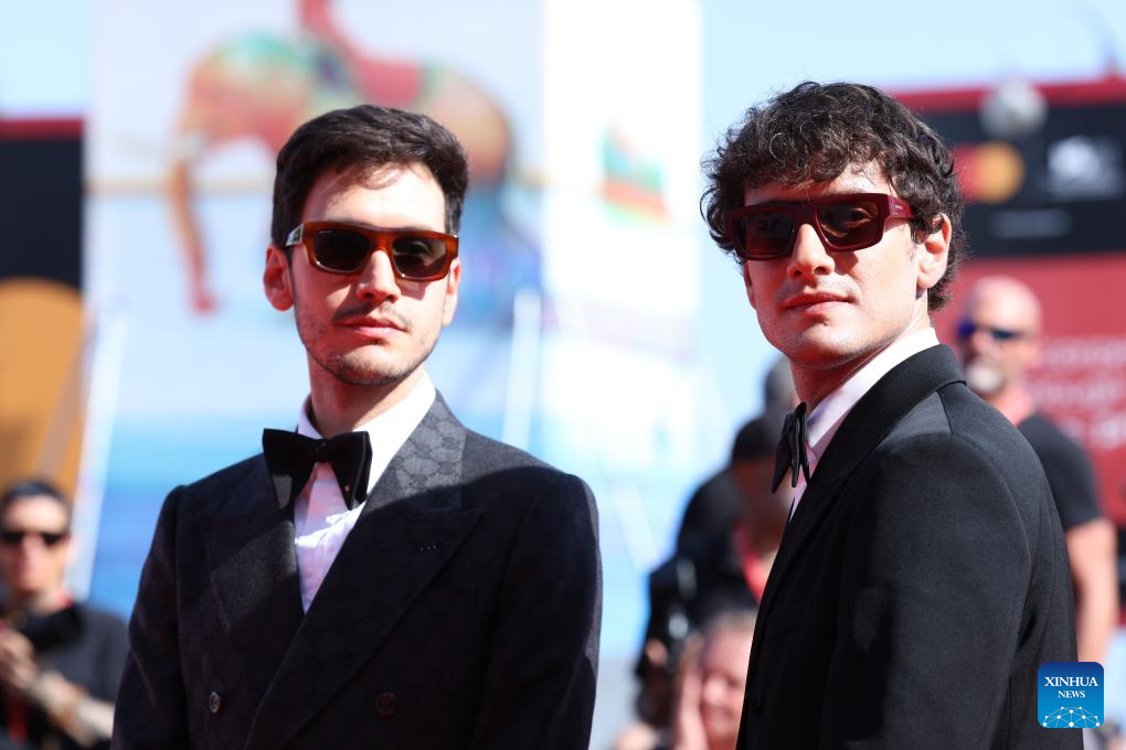 French director Zoran Boukherma (R) and Ludovic Boukherma pose at the red carpet before the premiere of the film "And Their Children After Them" during the 81st International Venice Film Festival in Venice, Italy, Aug. 31, 2024. (Xinhua/Li Jing)