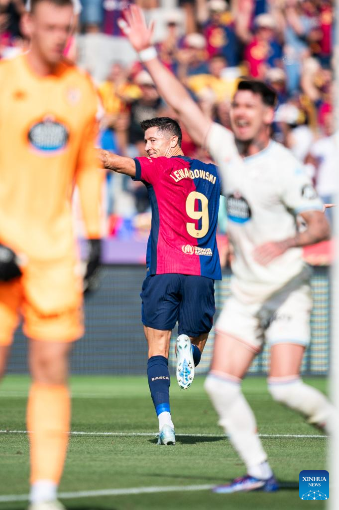 Robert Lewandowski (C) of Barcelona celebrates scoring during the Spanish league (La Liga) football match between FC Barcelona and Real Valladolid, in Barcelona, Spain, on Aug. 31, 2024. (Photo by Joan Gosa/Xinhua)
