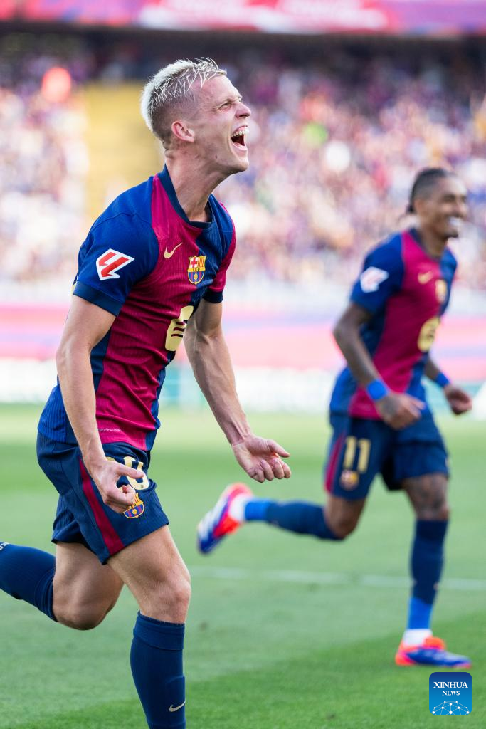 Dani Olmo of Barcelona celebrates his score during the Spanish league (La Liga) football match between FC Barcelona and Real Valladolid, in Barcelona, Spain, on Aug. 31, 2024. (Photo by Joan Gosa/Xinhua)