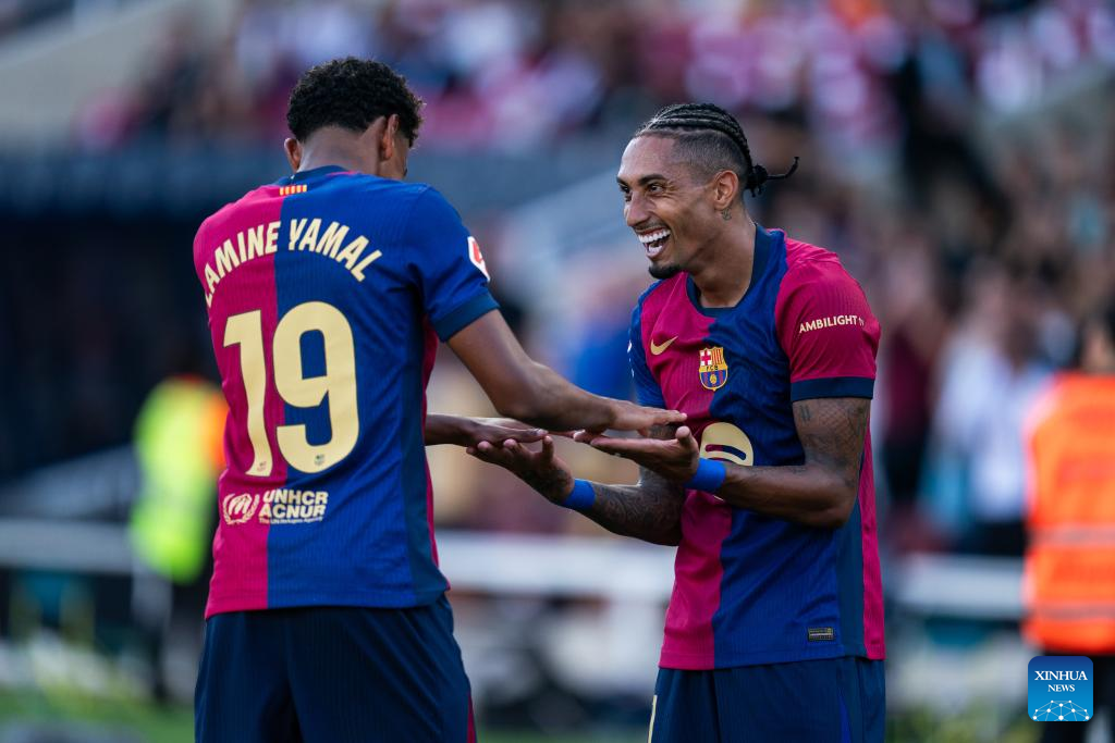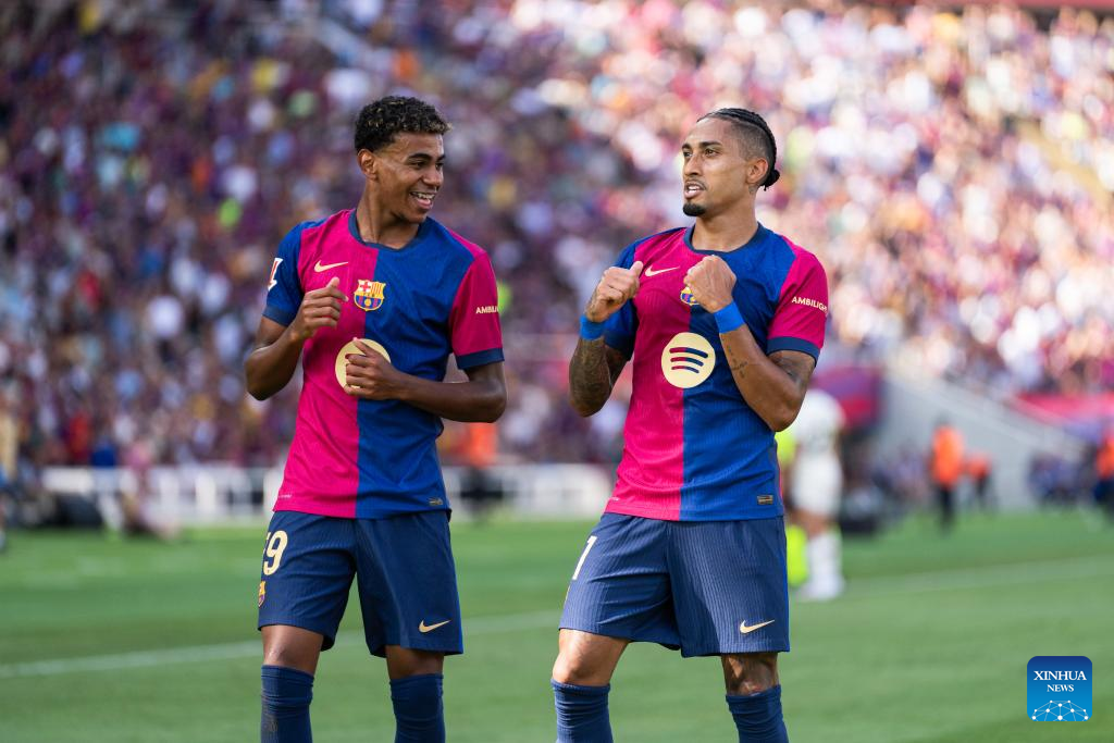 Raphinha (R) of Barcelona celebrates his score with teammate Lamine Yamal during the Spanish league (La Liga) football match between FC Barcelona and Real Valladolid, in Barcelona, Spain, on Aug. 31, 2024. (Photo by Joan Gosa/Xinhua)