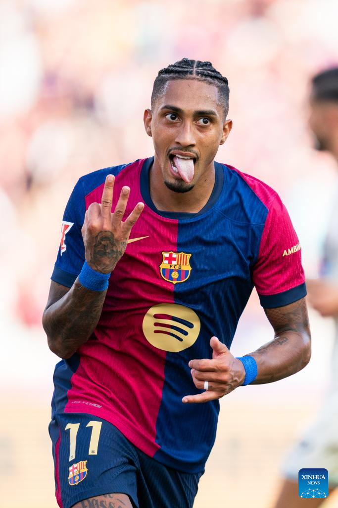 Raphinha of Barcelona celebrates his hat-trick during the Spanish league (La Liga) football match between FC Barcelona and Real Valladolid, in Barcelona, Spain, on Aug. 31, 2024. (Photo by Joan Gosa/Xinhua)