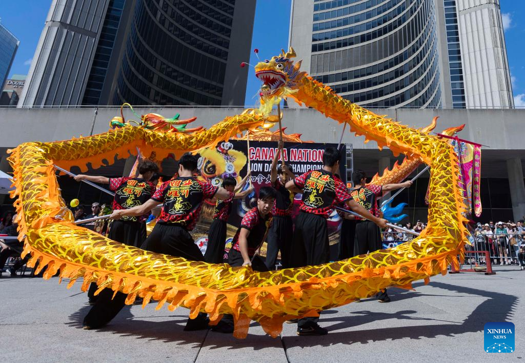 Artists perform dragon dance during the 2024 Toronto Dragon Festival at Nathan Phillips Square in Toronto, Canada, Sept. 1, 2024. (Photo by Zou Zheng/Xinhua)