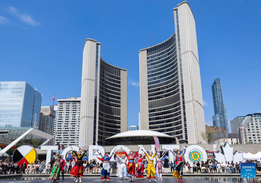 Models present traditional attire of Chinese ethnic minorities during the 2024 Toronto Dragon Festival at Nathan Phillips Square in Toronto, Canada, Sept. 1, 2024. (Photo by Zou Zheng/Xinhua)