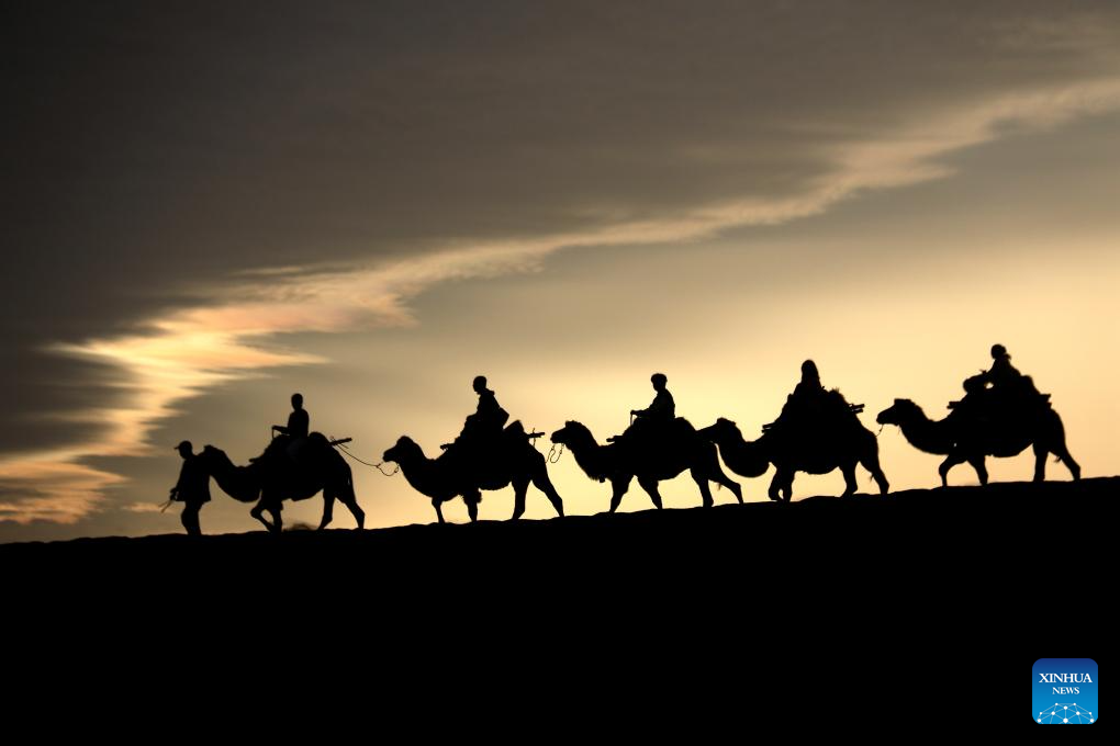 Camel-riding visitors enjoy the sights at the Mingsha Mountain and Crescent Spring scenic spot in the city of Dunhuang, northwest China's Gansu Province, Sept. 1, 2024. (Photo by Zhang Xiaoliang/Xinhua)