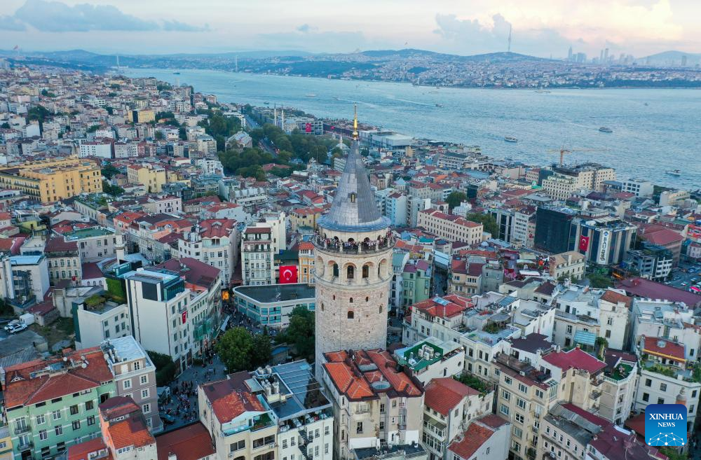 An aerial drone photo taken on Aug. 31, 2024 shows a scene of the Galata Tower in Istanbul, Türkiye. (Xinhua/Liu Lei)