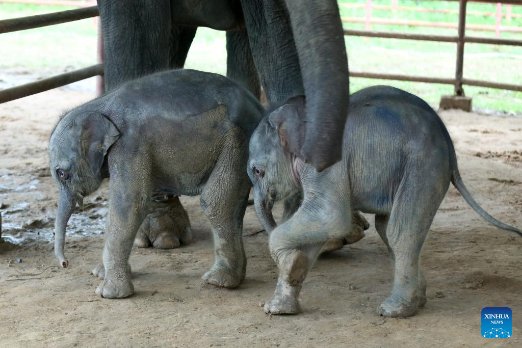 The twin baby elephants are pictured at the Wingabaw elephant camp in Bago region, Myanmar, Sept. 1, 2024. A rare occurrence of twin elephants, a male and a female, was recorded in southern Myanmar's Bago region.