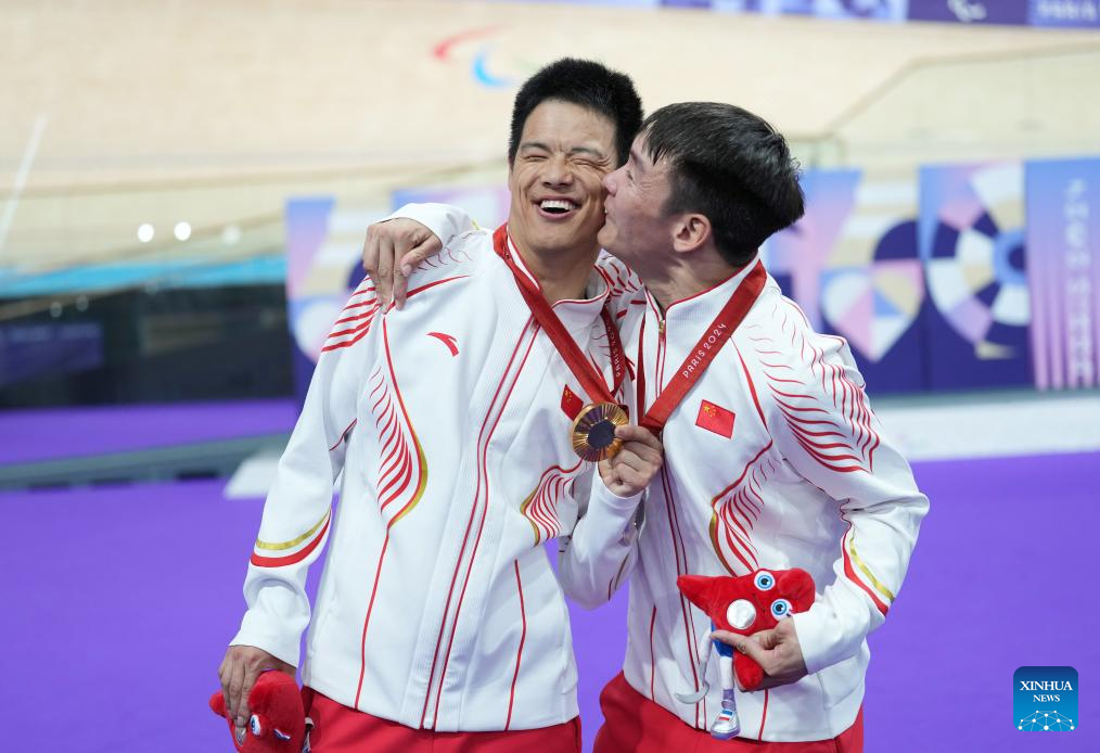 Silver medalist Liang Weicong (R) of China kisses gold medalist Li Zhangyu of China after the awarding ceremony for the men's C1-3 1000m time trial event of para cycling track at the Paris 2024 Paralympic Games in Paris, France, Aug. 31, 2024. (Xinhua/He Canling)