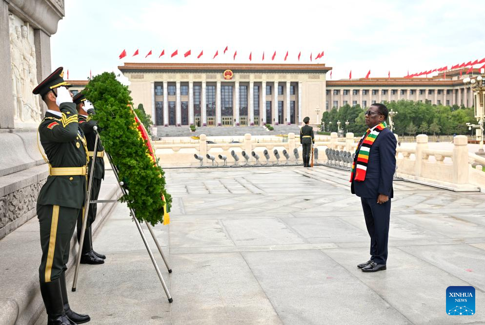 Zimbabwean president lays wreath at Monument to People's Heroes in Beijing