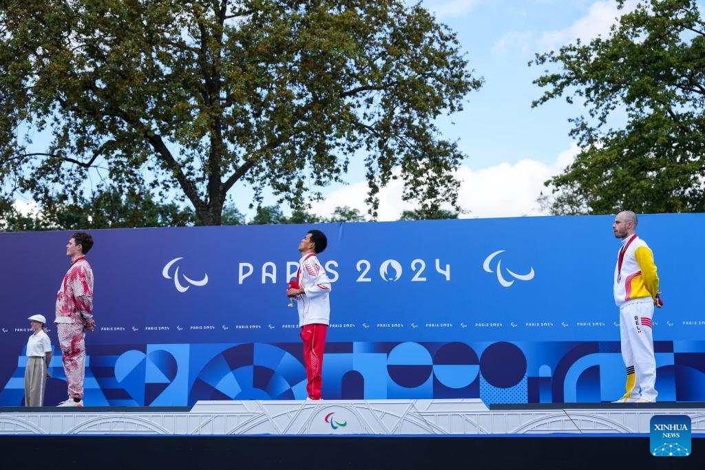 Gold medalist Chen Jianxin (C) of China, silver medalist Nathan Clement of Canada (L) and bronze medalist Tim Celen of Belgium are seen in the awarding ceremony of the men's T1-2 individual time trial of para cycling road event at the Paris 2024 Paralympic Games in Paris, France, Sept. 4, 2024. (Xinhua/Zhang Haofu)