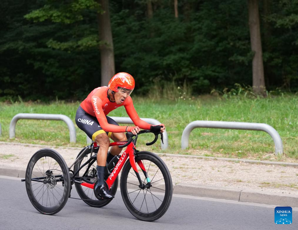 Chen Jianxin of China competes during the men's T1-2 individual time trial of para cycling road event at the Paris 2024 Paralympic Games in Paris, France, Sept. 4, 2024. (Xinhua/He Canling)