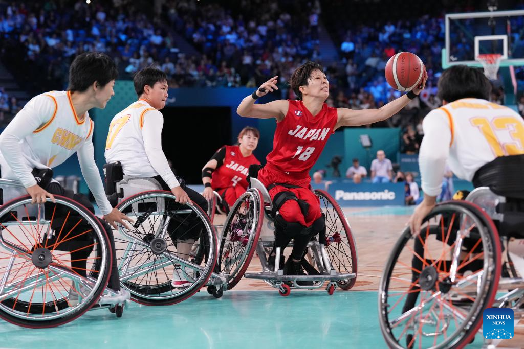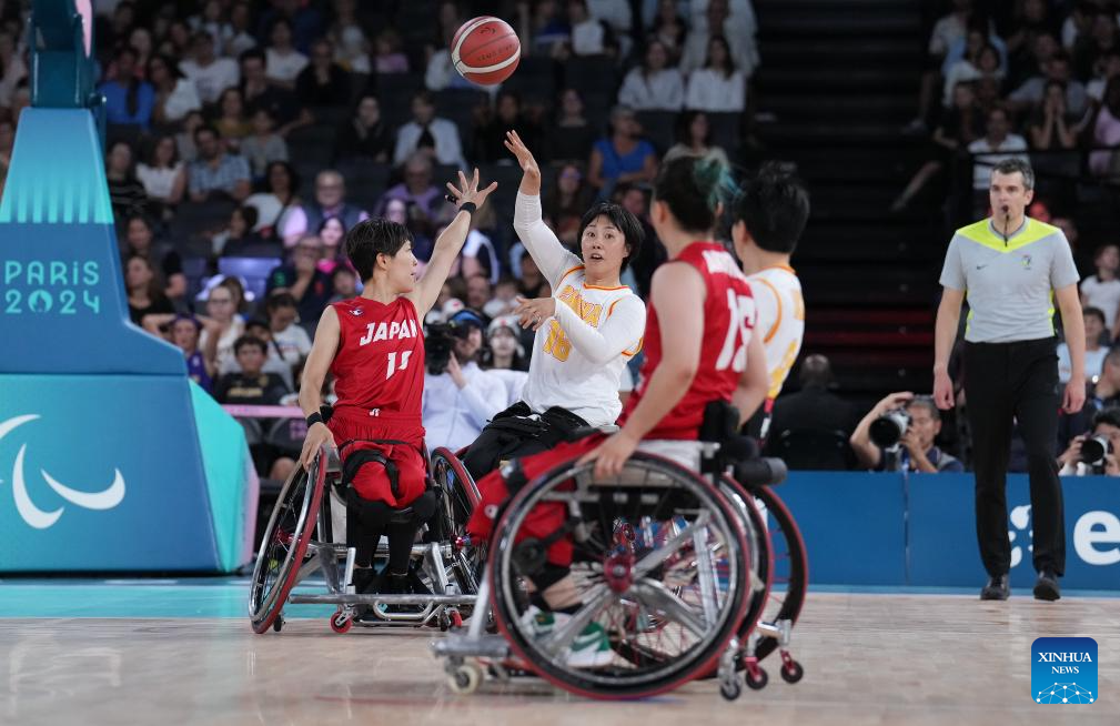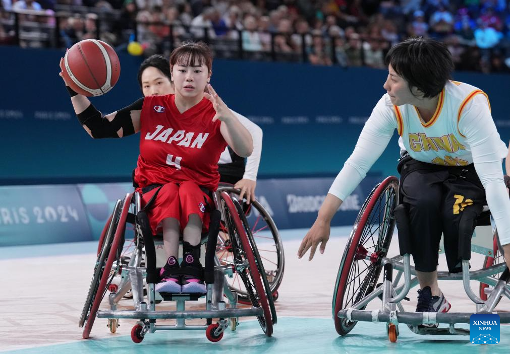 Yanagimoto Amane (2nd R) of Japan competes during the Wheelchair Basketball women's quarterfinal between China and Japan at the Paris 2024 Paralympic Games in Paris, France, Sep. 4, 2024. (Xinhua/Gao Jing)