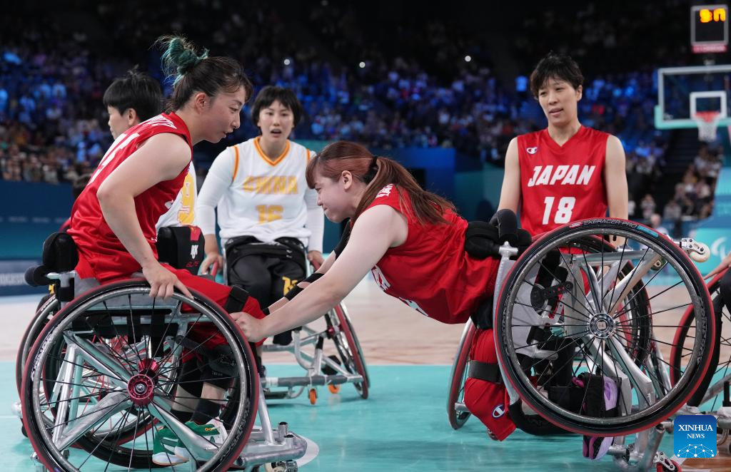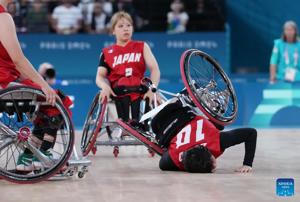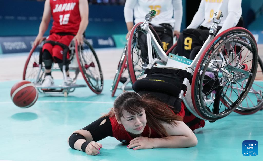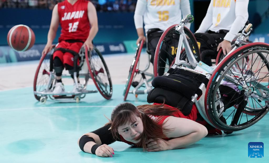 Yanagimoto Amane (R) of Japan falls on the court during the Wheelchair Basketball women's quarterfinal between China and Japan at the Paris 2024 Paralympic Games in Paris, France, Sep. 4, 2024. (Xinhua/Gao Jing)