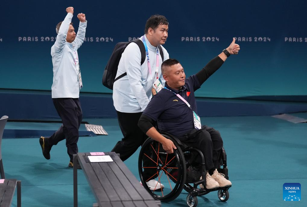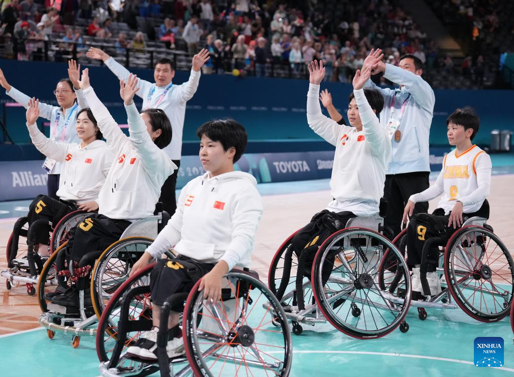 Players of China greet spectators after winning the Wheelchair Basketball women's quarterfinal between China and Japan at the Paris 2024 Paralympic Games in Paris, France, Sep. 4, 2024. (Xinhua/Gao Jing)