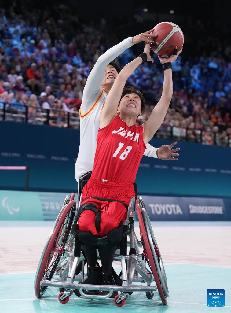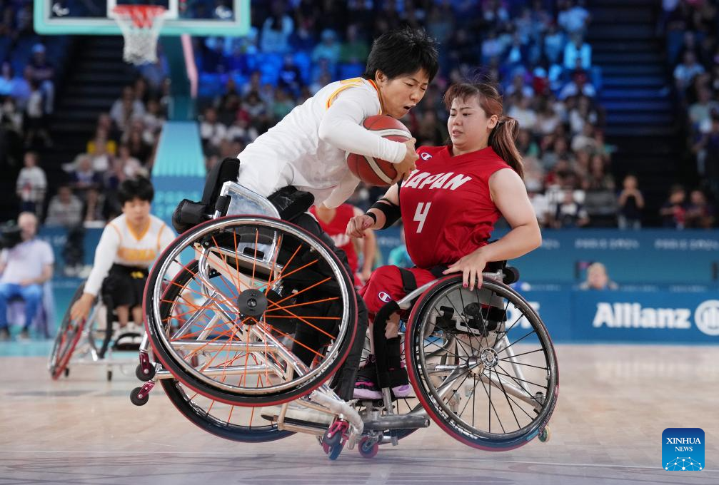 Yanagimoto Amane (R) of Japan competes during the Wheelchair Basketball women's quarterfinal between China and Japan at the Paris 2024 Paralympic Games in Paris, France, Sep. 4, 2024. (Xinhua/Gao Jing)