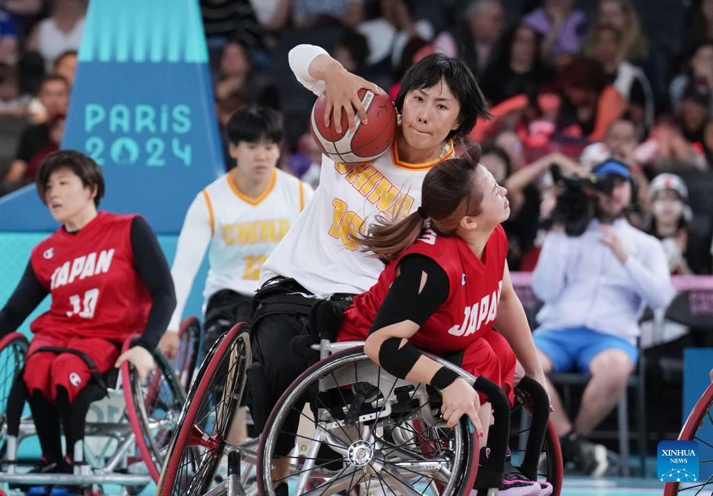 Dai Jiameng (2nd R) of China competes during the Wheelchair Basketball women's quarterfinal between China and Japan at the Paris 2024 Paralympic Games in Paris, France, Sep. 4, 2024. (Xinhua/Gao Jing)