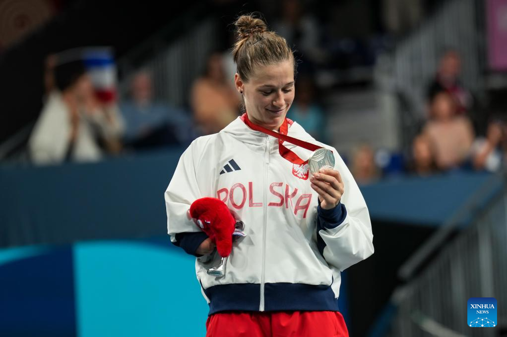 Silver medalist Natalia Partyka of Poland looks at the medal during the awarding ceremony after the Para Table Tennis women's singles WS10 final against Yang Qian of Australia at the Paris 2024 Paralympic Games in Paris, France, Sept. 4, 2024. (Xinhua/Zhang Cheng)