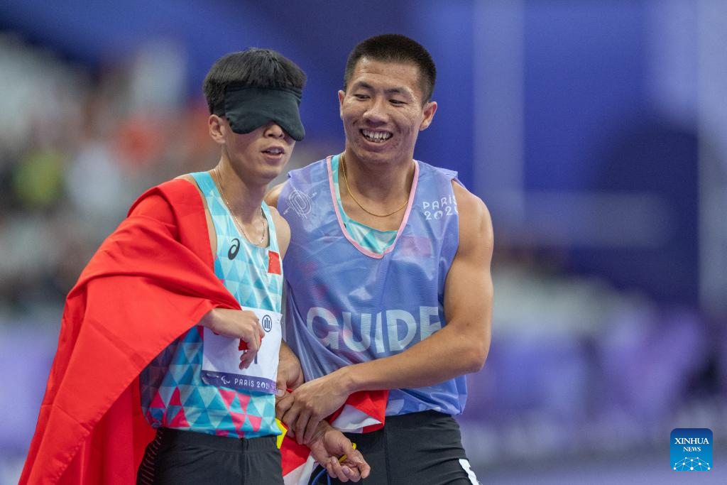 Di Dongdong (L) of China celebrates with his guide Lian Jiageng after the men's 100m T11 Final of Para Athletics at the Paris 2024 Paralympic Games in Paris, France, Sept. 5, 2024. (Xinhua/Huang Wei)
