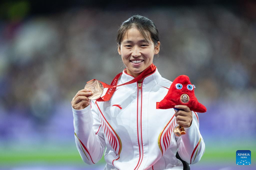 Bronze medalist Zhou Zhaoqian of China poses during the awarding ceremony for during the women's 400m T54 event of Para Athletics at the Paris 2024 Paralympic Games in Paris, France, Sept. 5, 2024. (Xinhua/Huang Wei)