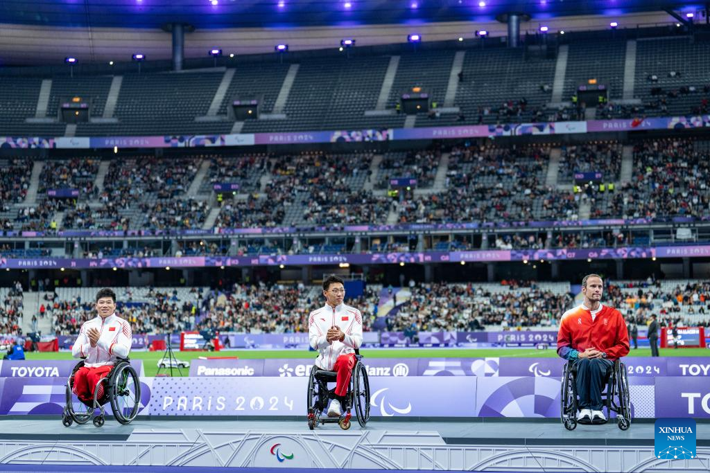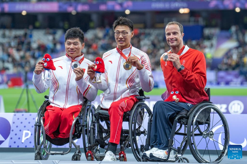 Gold medalist Jin Hua (C) of China, silver medalist Dai Yunqiang (L) of China and bronze medalist Marcel Hug of Switzerland pose during the awarding ceremony for the men's 800m T54 event of Para Athletics at the Paris 2024 Paralympic Games in Paris, France, Sept. 5, 2024. (Xinhua/Huang Wei)