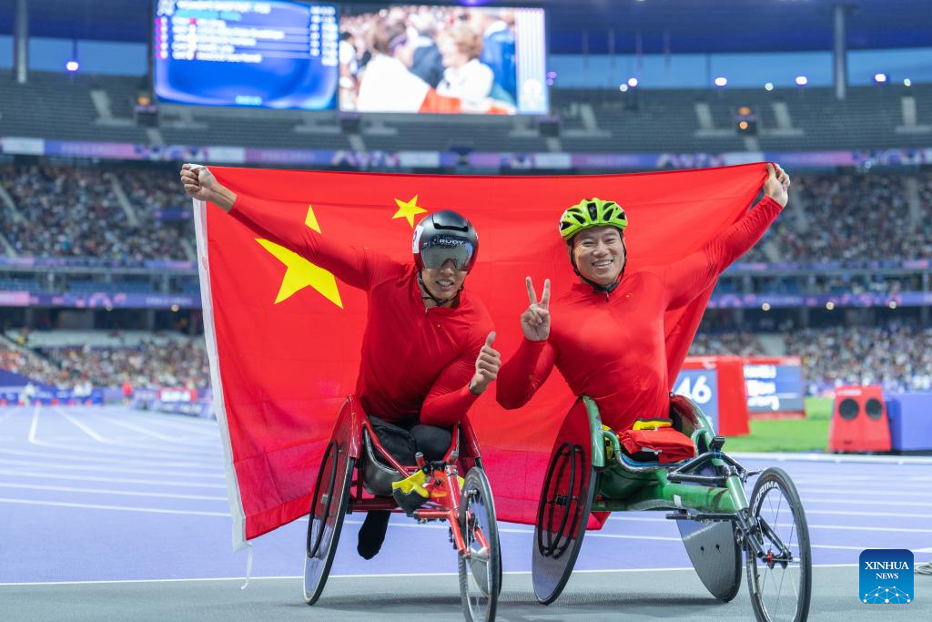Jin Hua (L) and Dai Yunqiang of China pose after the men's 800m T54 Final of Para Athletics at the Paris 2024 Paralympic Games in Paris, France, Sept. 5, 2024. (Xinhua/Huang Wei)