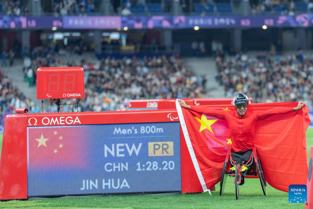 Jin Hua of China poses with his new record after the men's 800m T54 Final of Para Athletics at the Paris 2024 Paralympic Games in Paris, France, Sept. 5, 2024. (Xinhua/Huang Wei)