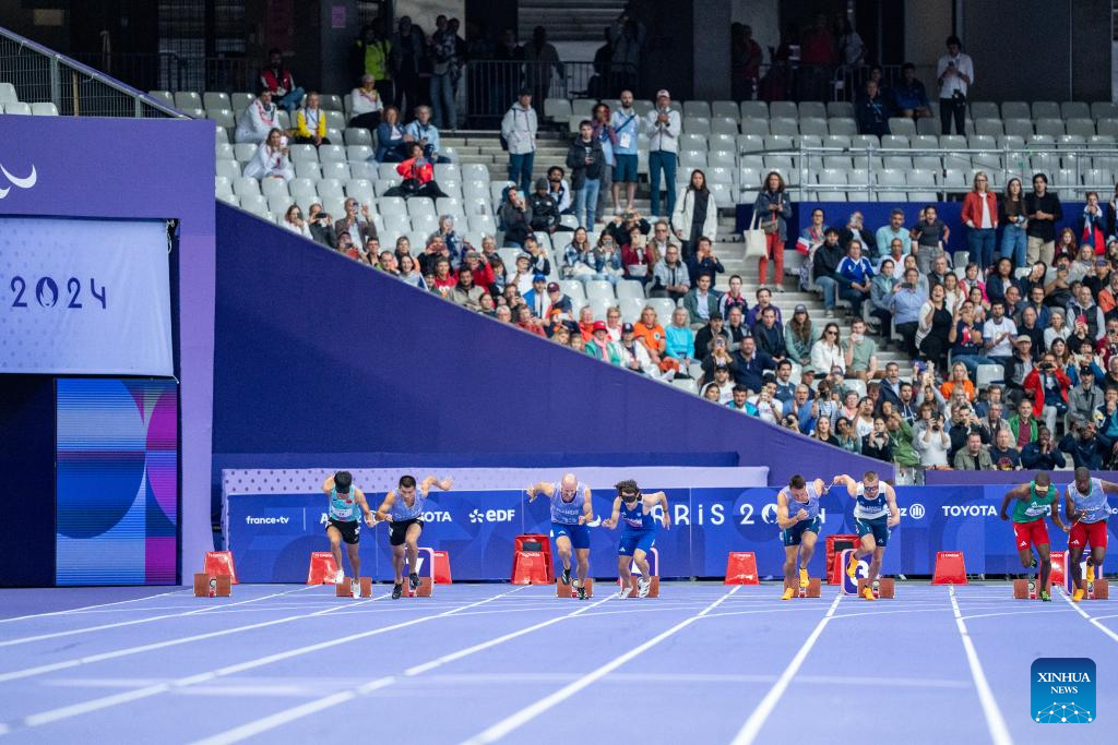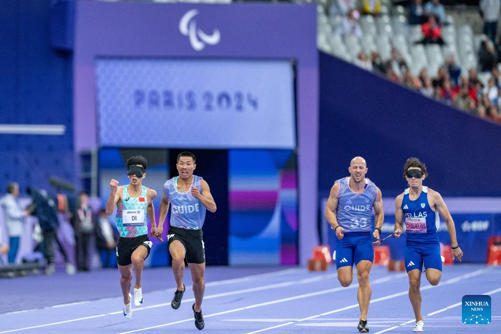 Athletes and their guides compete during the men's 100m T11 Final of Para Athletics at the Paris 2024 Paralympic Games in Paris, France, Sept. 5, 2024. (Xinhua/Huang Wei)