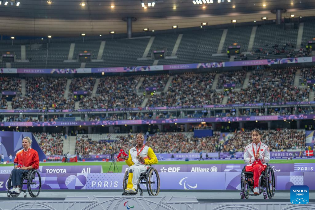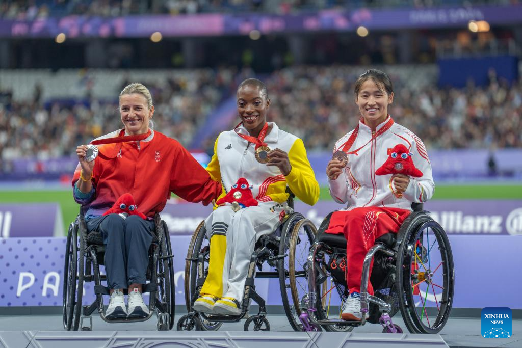 Gold medalist Lea Bayekula (C) of Belgium, silver medalist Manuela Schaer (L) of Switzerland and bronze medalist Zhou Zhaoqian of China pose during the awarding ceremony for the women's 400m T54 event of Para Athletics at the Paris 2024 Paralympic Games in Paris, France, Sept. 5, 2024. (Xinhua/Huang Wei)