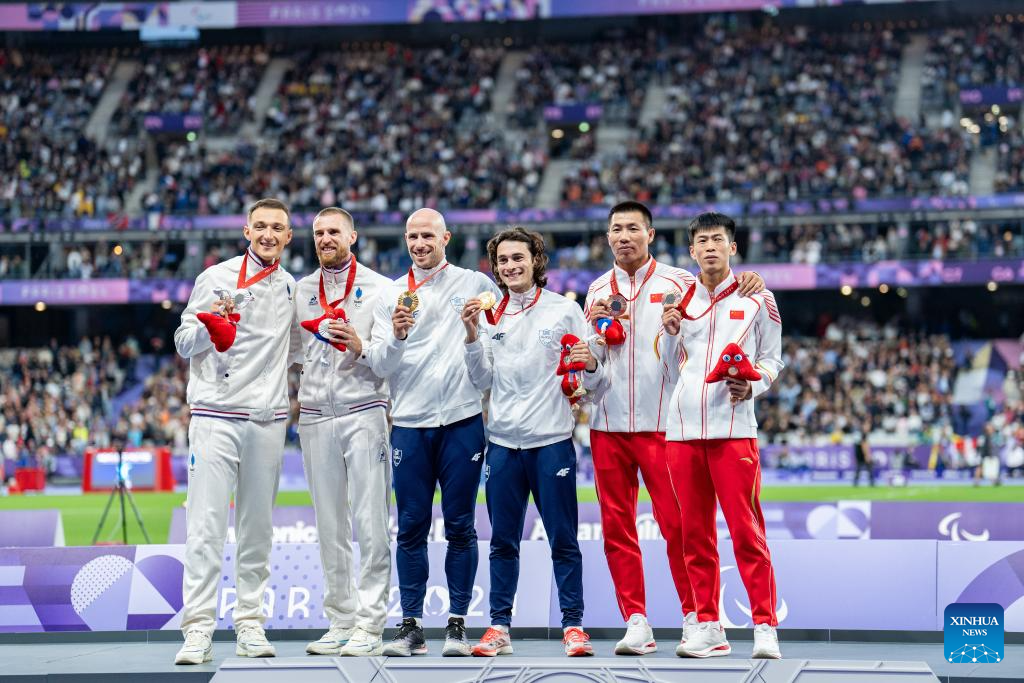 Gold medalists Athanasios Ghavelas (3rd R) and his guide Ioannis Nyfantopoulos (3rd L) of Greece, silver medalists Timothee Adolphe (2nd L) and his guide Charles Renard (1st L), bronze medalists Di Dongdong (1st R) and his guide Lian Jiageng of China pose during the awarding ceremony for the men's 100m T11 event of Para Athletics at the Paris 2024 Paralympic Games in Paris, France, Sept. 5, 2024. (Xinhua/Huang Wei)