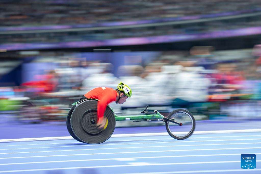 Jin Hua of China competes during the men's 800m T54 Final of Para Athletics at the Paris 2024 Paralympic Games in Paris, France, Sept. 5, 2024. (Xinhua/Huang Wei)