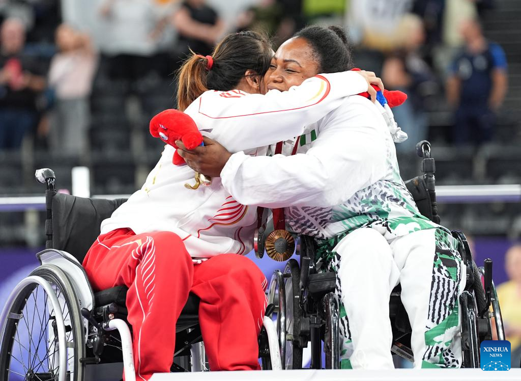 Gold medalist Onyinyechi Mark (R) of Nigeria hugs silver medalist Cui Jianjin of China during the awarding ceremony for the para powerlifting women's up to 61kg event at the Paris 2024 Paralympic Games in Paris, France, Sept. 6, 2024. (Xinhua/Lian Yi)