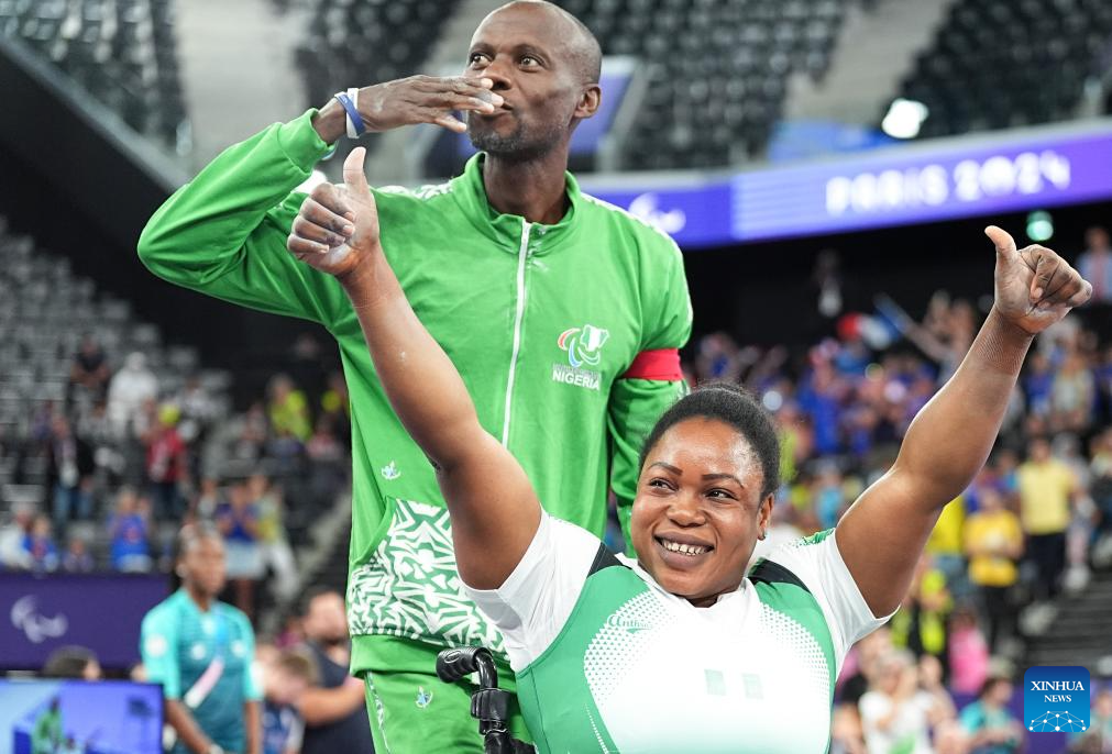 Onyinyechi Mark (R) of Nigeria celebrates after winning the para powerlifting women's up to 61kg final at the Paris 2024 Paralympic Games in Paris, France, Sept. 6, 2024. (Xinhua/Lian Yi)