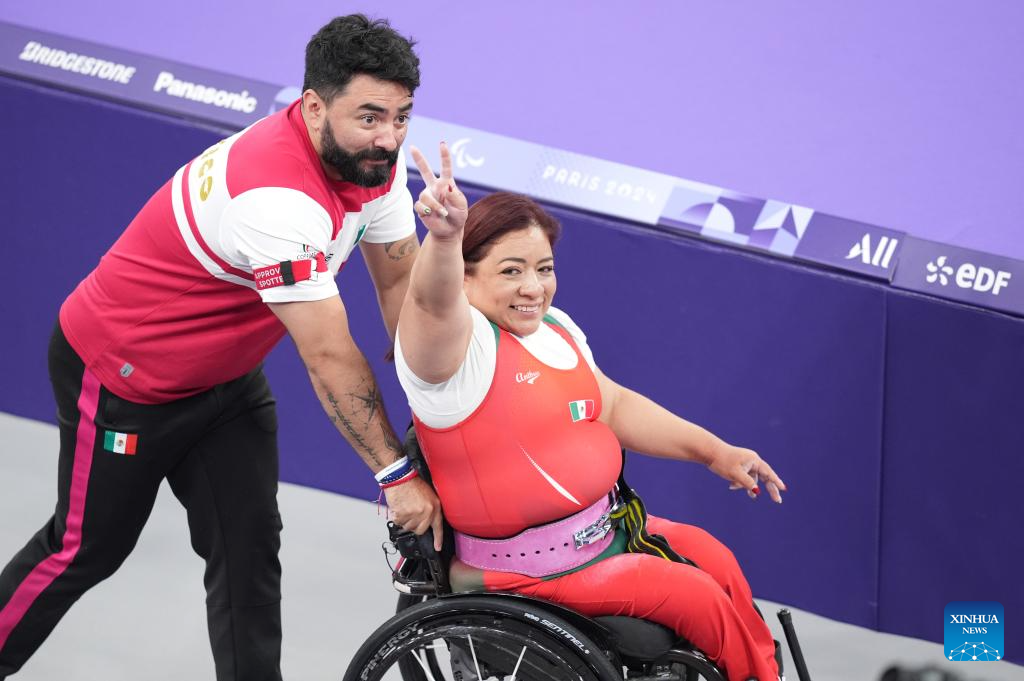 Amalia Perez Vazquez (R) of Mexico celebrates after the para powerlifting women's up to 61kg final at the Paris 2024 Paralympic Games in Paris, France, Sept. 6, 2024. (Xinhua/Lian Yi)
